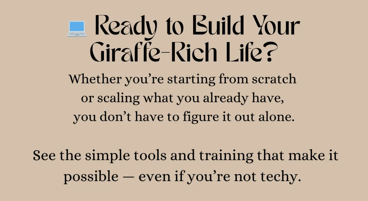 I started Giraffe Rich Momma™ to show moms that building an online business doesn’t have to be complicated or techy — it can be simple, meaningful, and designed around real life.